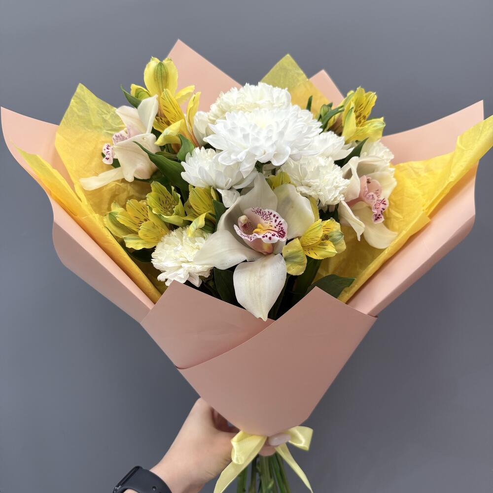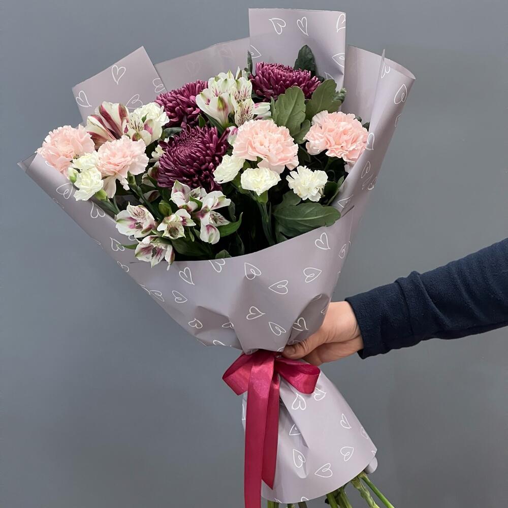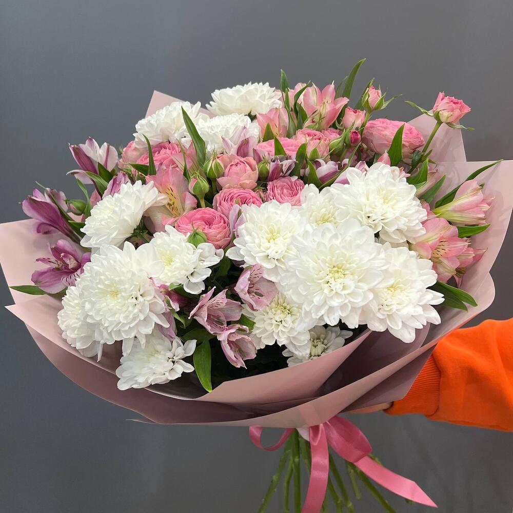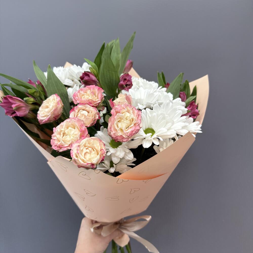 Состав Альстромерия - 7 шт. Хризантема кустовая - 3 шт. Кустовая роза - 3 шт. Авторская упаковка с лентой - 1 шт. Размер букета: ширина - 45 см, высота - 50 см