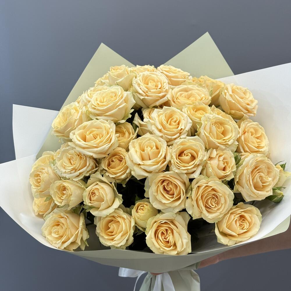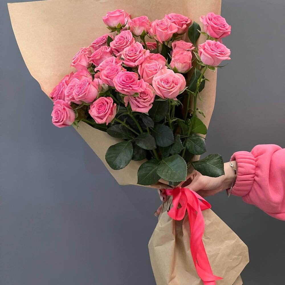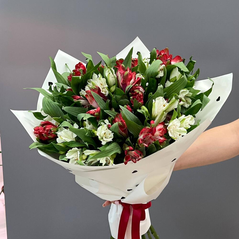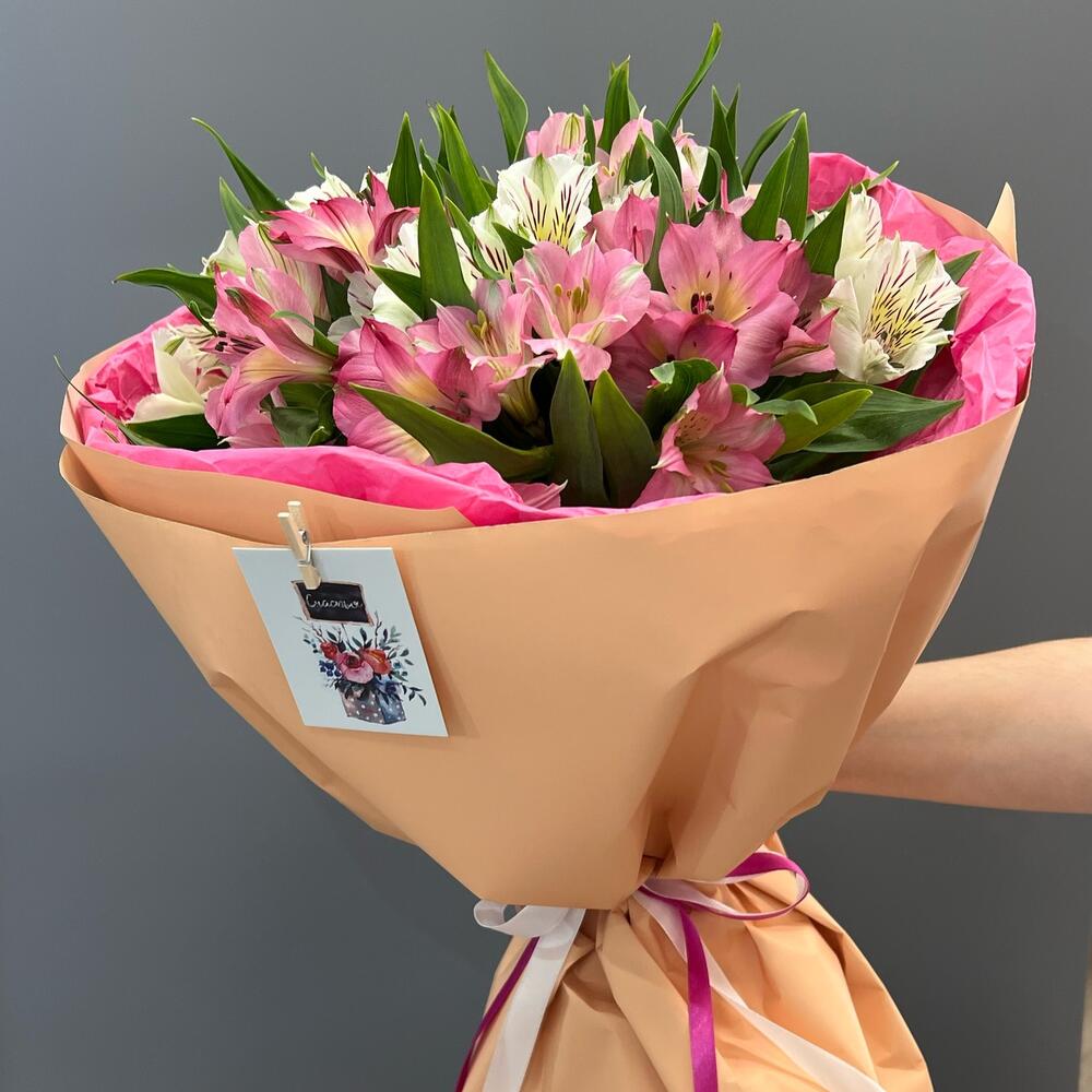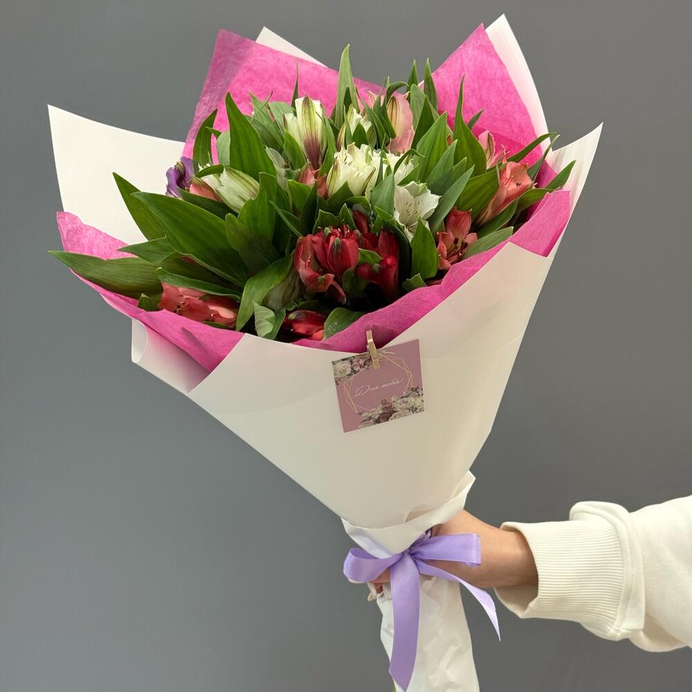 Состав Альстромерия - 7 шт. Хризантема кустовая - 3 шт. Кустовая роза - 3 шт. Авторская упаковка с лентой - 1 шт. Размер букета: ширина - 45 см, высота - 50 см