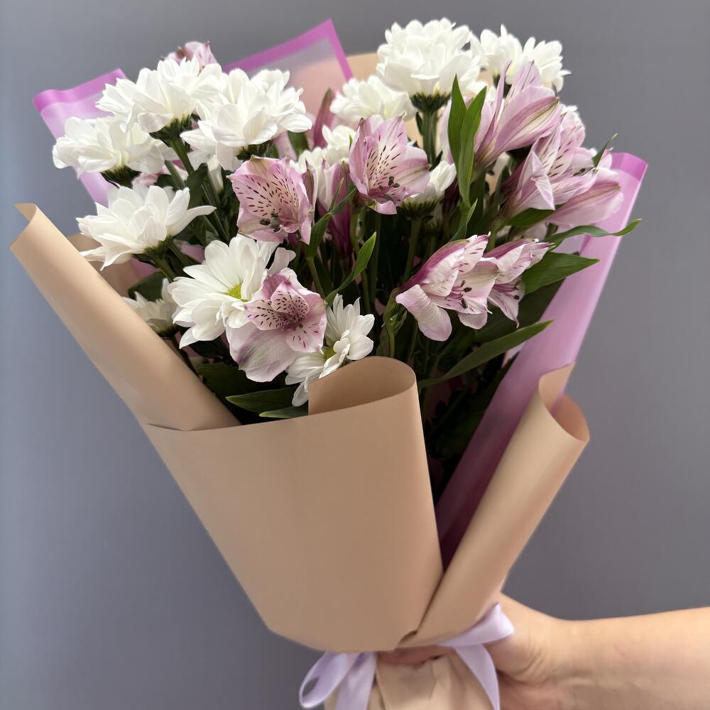 Состав Альстромерия - 4 шт. Хризантема кустовая - 2 шт. Кустовая роза - 1 шт. Авторская упаковка с лентой - 1 шт. Размер букета: ширина - 30 см, высота - 40 см
